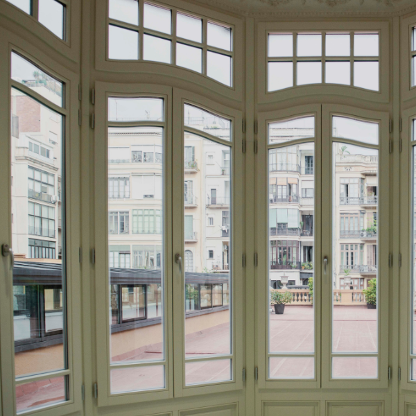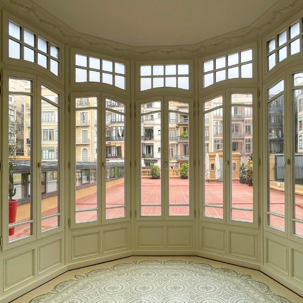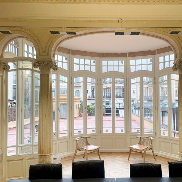 Las carpinterías originales se encontraban bastante deterioradas, tanto en su recubrimiento de pintura como en su estructura. Por lo que la sustitución tenía que realizarse completamente, retirando la totalidad de las piezas antiguas y colocando en su lugar piezas nuevas que, manteniendo la decoración, garantizaran las mejores prestaciones técnicas de aislamiento.